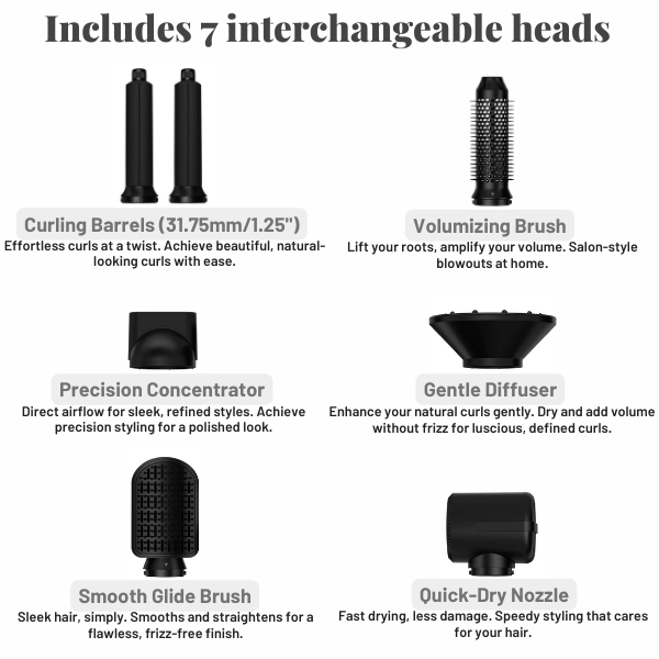 The AirStyler redefines convenience with its intuitive design. Switch effortlessly among drying, straightening, curling, and blow-drying with just a click. Each of the seven bespoke attachments promises a new look that's both easy to achieve and stunningly effective.